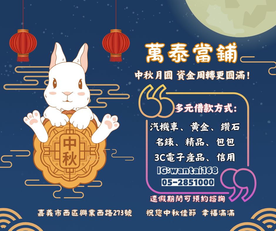 《嘉義大林當舖汽機車借款》 一年一度令大家最開心最期待的中秋家人團聚終於快到了 ,如您需要資金急需用錢,可來電詢問諮詢,萬泰隨時都在 過節免苦惱,找我們最實在! 中秋聚餐、送禮都OK,週轉資金輕鬆搞定。 嘉義萬泰當舖服務超全面: 🚗 汽車、機車不限車齡、車種 📱 手機、平板、各式3C產品 💍 黃金、鑽石、名錶、精品包都能辦理 ✅ 免費現場鑑估,流程透明 ✅ 彈性額度,依資產評估安排 ✅ 專人一對一服務,安心又放心 短期資金調度或臨時安排,萬泰隨時在嘉義陪伴你💪 🔸🔸🔸🔸🔸🔸🔸🔸🔸🔸 ⭕不限資產種類 ⭕依條件彈性安排 ⭕滿18都可以詢問 ———🔜歡迎來電洽詢🔜——— ▌💬諮詢超方便 | 嘉義萬泰當舖 ▌ 📞 05-2851000 🟢 官方LINE : @eeh0165h 🟧 IG : wantai168 🚩 地址:嘉義市西區興業西路273號 #嘉義借款 #嘉義汽車借款 #嘉義當鋪 #嘉義機車借款 #5萬內小額借款 #資金周轉 #萬泰當舖 #手機借款 #信用借款 #民雄借款 #汽車借款 #機車借款 #嘉義借款 #借錢 #小額借款 #當鋪 #黃金借款 #免留車 #民雄當鋪 #太保汽車借款 #太保機車借款 #朴子汽車借款 #朴子汽車借款